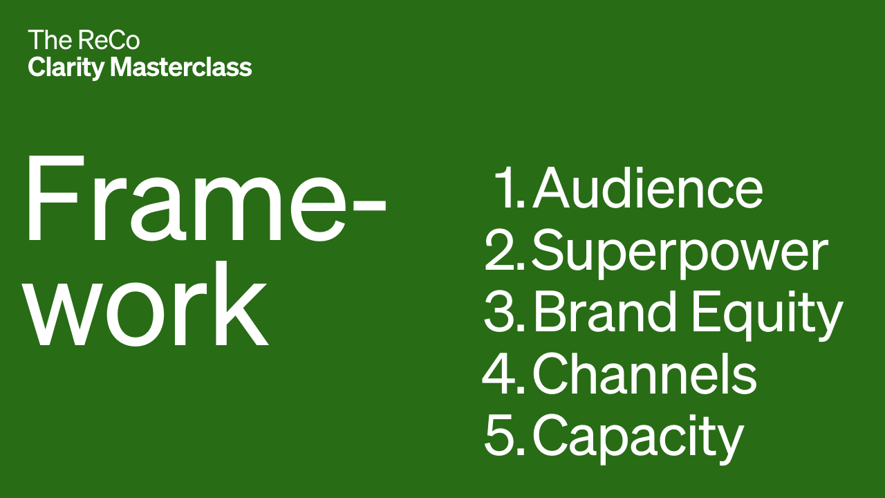 The ReCo Clarity Masterclass is a 5-part framework to help you understand what your marketing actually needs, before hiring anyone or investing another dollar.